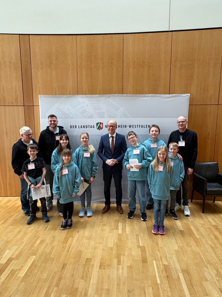 Das Kinderparlament hatte einen ganz besonderen Ausflug: Es ging in den Landtag nach Düsseldorf! Eingeladen hatte uns der Politiker Raphael Tigges und wir waren alle ganz aufgeregt. Am 10.03.26 haben wir uns gemeinsam mit dem Zug auf nach Düsseldorf gemacht, dabei wurden wir begleitet von Torsten Obeloer, Inga Schuchard und Yannik Baumhöfner.